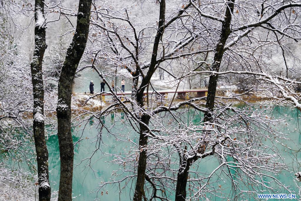 DANGCHANG, 19 mars (Xinhua) -- Des touristes profitent du paysage de la zone touristique de Guan'egou après une chute de neige, dans le district de Dangchang, à Longnan, dans la province chinoise du Gansu (nord-ouest), le 18 mars 2026. (Photo : Liu Hui)