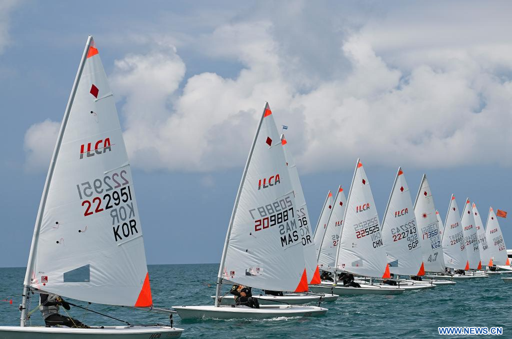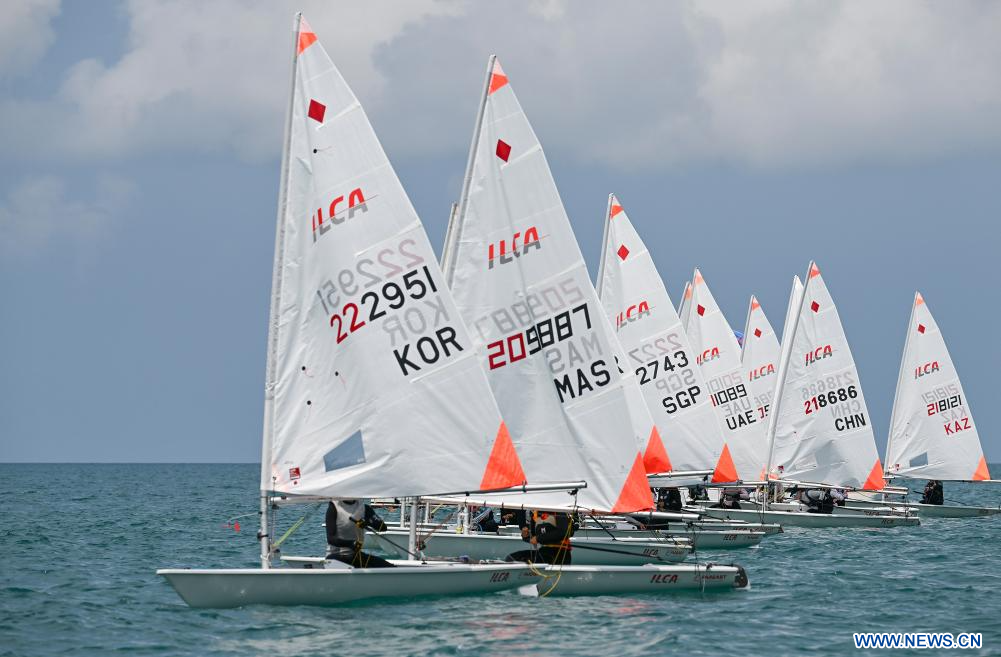 SANYA, 27 avril (Xinhua) -- Des athlètes s'affrontent lors de la régate ILCA4 masculine aux 6es Jeux asiatiques de plage à Sanya, dans la province chinoise de Hainan (sud), le 27 avril 2026. (Photo : Wei Hai)