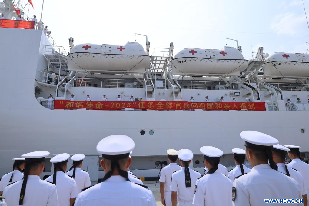 SANYA, 27 avril (Xinhua) -- Photo prise le 26 avril 2026 montrant la cérémonie d'accueil organisée pour le navire-hôpital de la Marine de l'Armée populaire de libération (APL) de Chine, l'Arche de la Route de la Soie, dans un port militaire à Sanya, dans la province de Hainan (sud de la Chine). (Photo : Cui Xiaoyang)