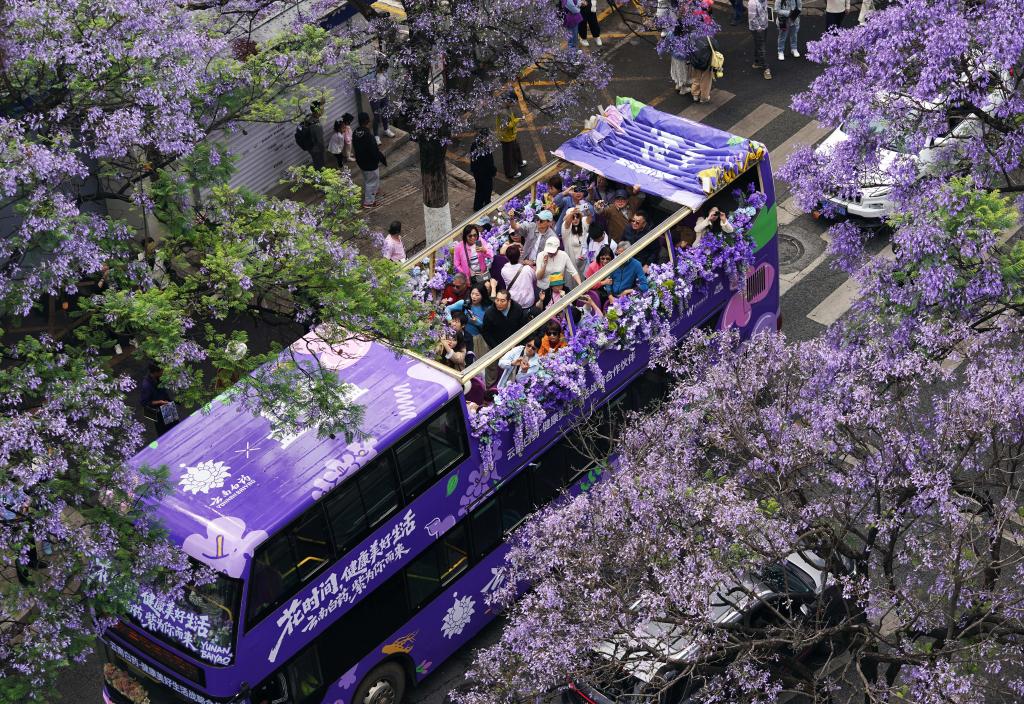 KUNMING, 28 avril (Xinhua) -- Des touristes prennent un bus touristique pour admirer les jacarandas en fleurs à Kunming, dans la province chinoise du Yunnan (sud-ouest), le 27 avril 2026. (Photo: Liang Zhiqiang)