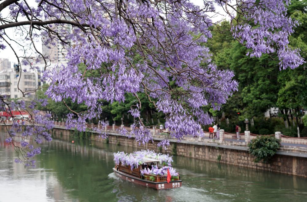 KUNMING, 28 avril (Xinhua) -- Des touristes admirent les jacarandas en fleurs depuis un bateau à Kunming, dans la province chinoise du Yunnan (sud-ouest), le 27 avril 2026. (Photo : Liang Zhiqiang)