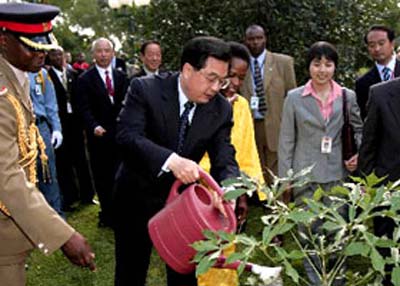 Hu plantant un arbre pour souvenir dans le jardin de l'ONU-HABITAT et PNUE