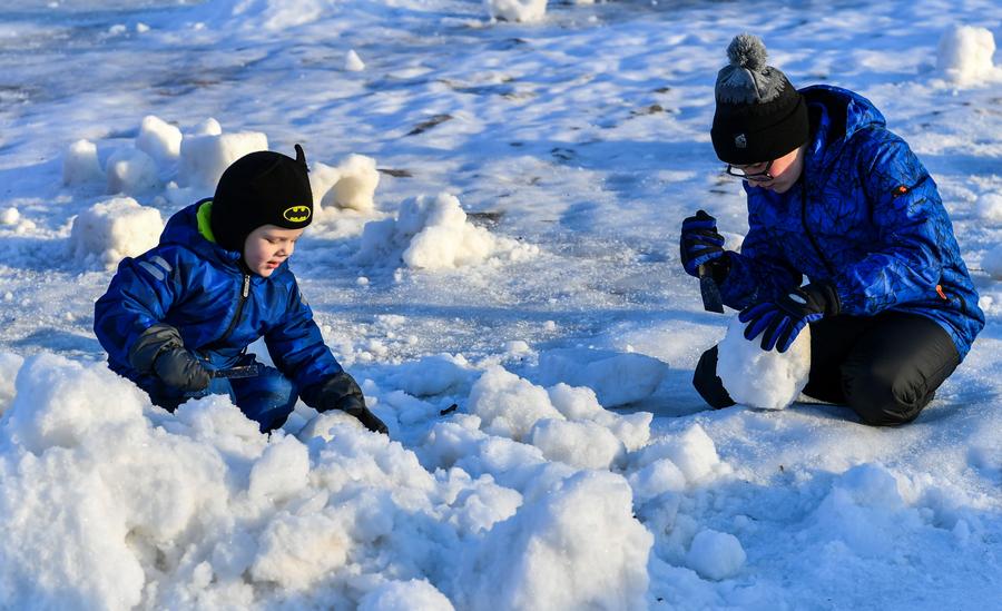 Des enfants s'amusent avec la neige à Moscou, en Russie, le 2 janvier 2023. (Xinhua/Cao Yang)