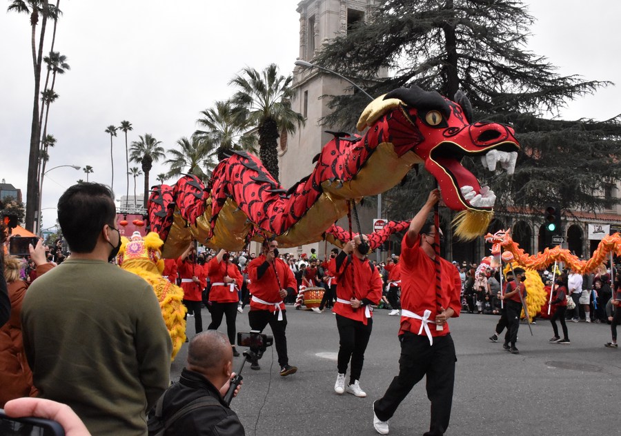 Une danse du dragon lors des célébrations du Nouvel An chinois dans le comté de Riverside, en Californie, aux Etats-Unis, le 29 janvier 2022. (Xinhua)