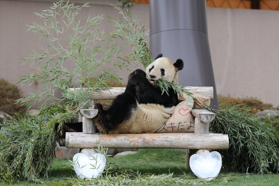Le panda géant Eimei mange du bambou à l'Adventure World de Shirahama, dans la préfecture de Wakayama, au Japon, le 14 février 2019. (Xinhua/Du Xiaoyi)