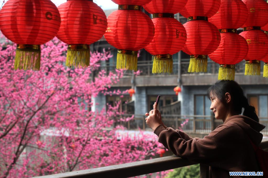 CHONGQING, 26 février (Xinhua) -- Une touriste prend des photos dans le bourg ancien de Zhuoshui, dans l'arrondissement de Qianjiang, à Chongqing (sud-ouest de la Chine), le 25 février 2023. (Photo : Yang Min)