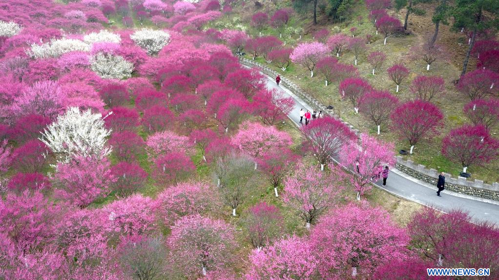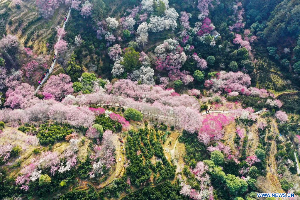 HUANGSHAN, 26 février (Xinhua) -- Photo aérienne des fleurs épanouies dans le bourg Xiongcun du distrcit de Shexian, dans la province chinoise de l'Anhui (est), le 25 février 2023. (Photo : Fan Chengzhu)