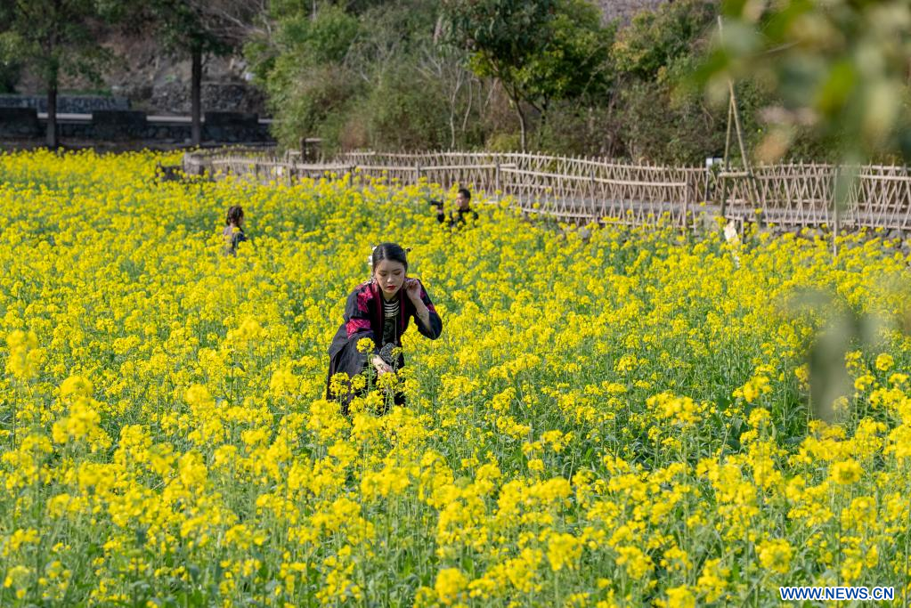 CONGJIANG, 26 février (Xinhua) -- Des gens visitent un champ de colza dans le district de Liping, dans la province chinoise du Guizhou (sud-ouest), le 25 février 2023. (Photo : Wu Xingke)