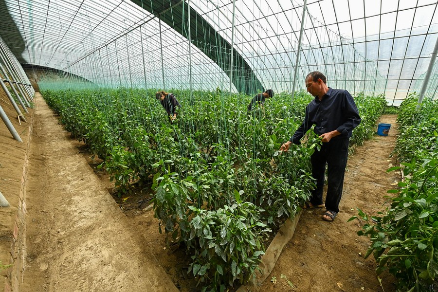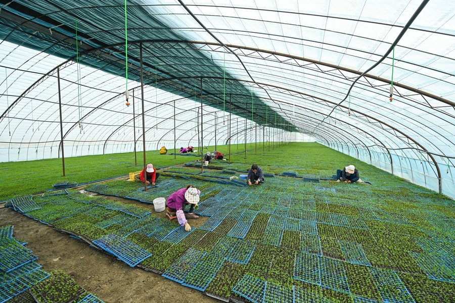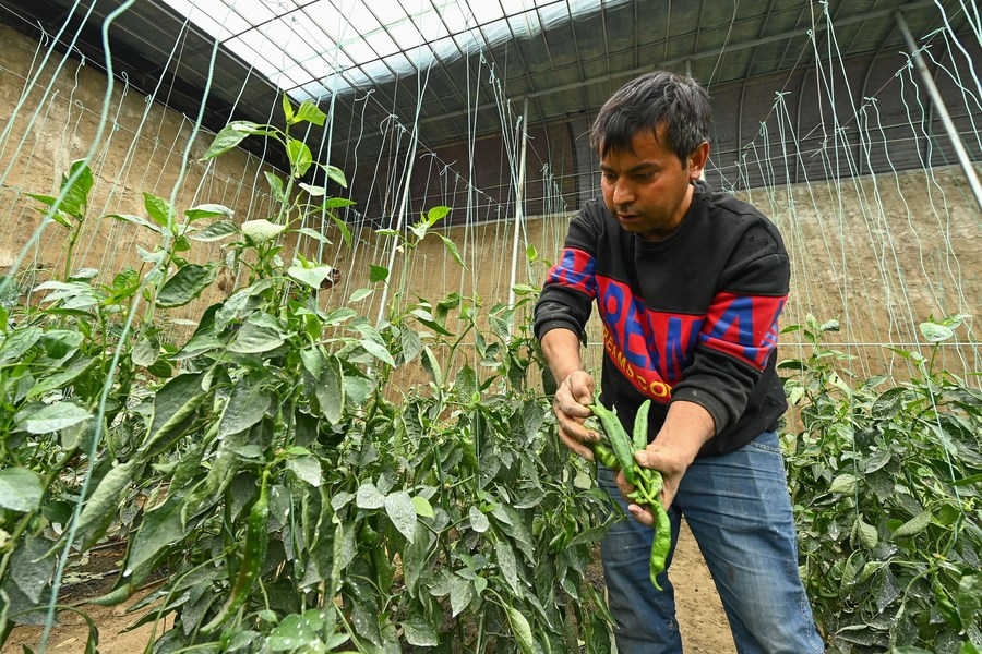 Un villageois travaille dans une serre solaire intelligente d'une zone de démonstration de l'agriculture moderne du district de Bohu, dans la région autonome ouïgoure du Xinjiang, dans le nord-ouest de la Chine, le 19 mars 2023. (Photo : Ding Lei)