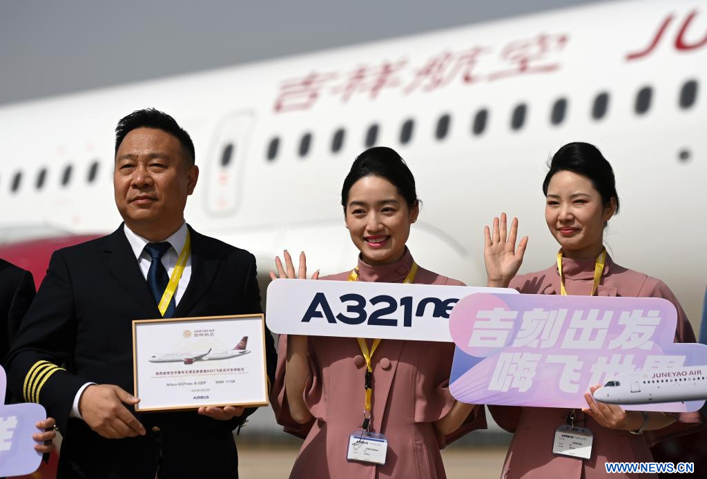 TIANJIN, 25 mars (Xinhua) -- Photo prise le 24 mars 2023 du premier avion A321neo assemblé à Tianjin, dans le nord de la Chine. Le constructeur aéronautique européen Airbus a commencé vendredi à livrer des avions A321neo assemblés sur son site de la chaîne d'assemblage final en Asie, à Tianjin. Le premier A321neo assemblé en Chine a été livré à la compagne aérienne Juneyao Air. (Photo : Zhao Zishuo)