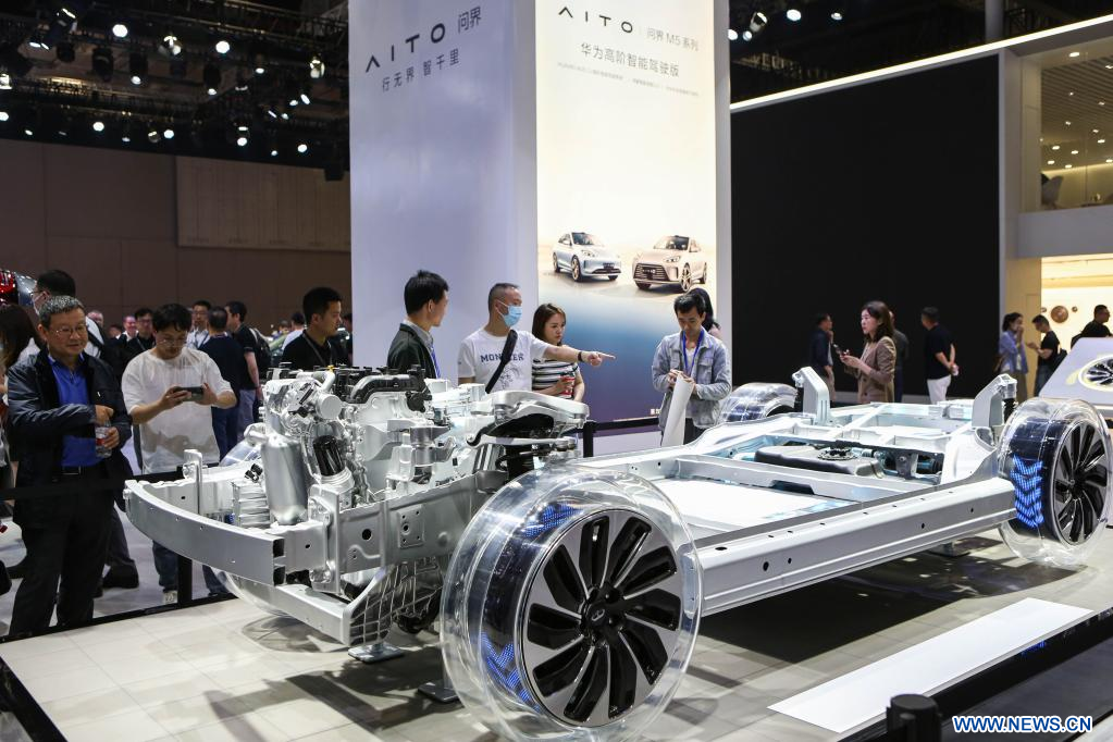 SHANGHAI, 20 avril (Xinhua) -- Une plate-forme 4MATIC intelligente et longue distance Aito M5 exposée à la 20e édition du Salon international de l'industrie automobile de Shanghai (Auto Shanghai), à Shanghai, dans l'est de la Chine, le 18 avril 2023. La 20e édition d'Auto Shanghai a débuté mardi au Centre national des expositions et des congrès (Shanghai). A cette occasion, de nombreux constructeurs automobiles présentent leurs véhicules connectés intelligents et à énergies nouvelles dans le cadre de la tendance à la consommation verte et à faibles émissions de carbone. (Photo : Xin Mengchen)