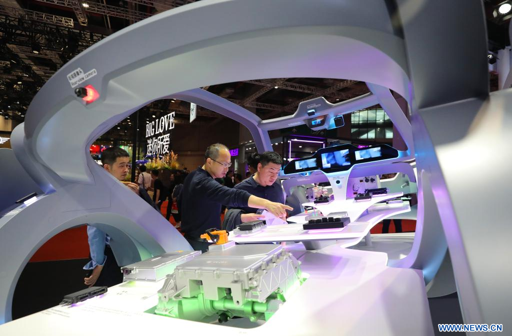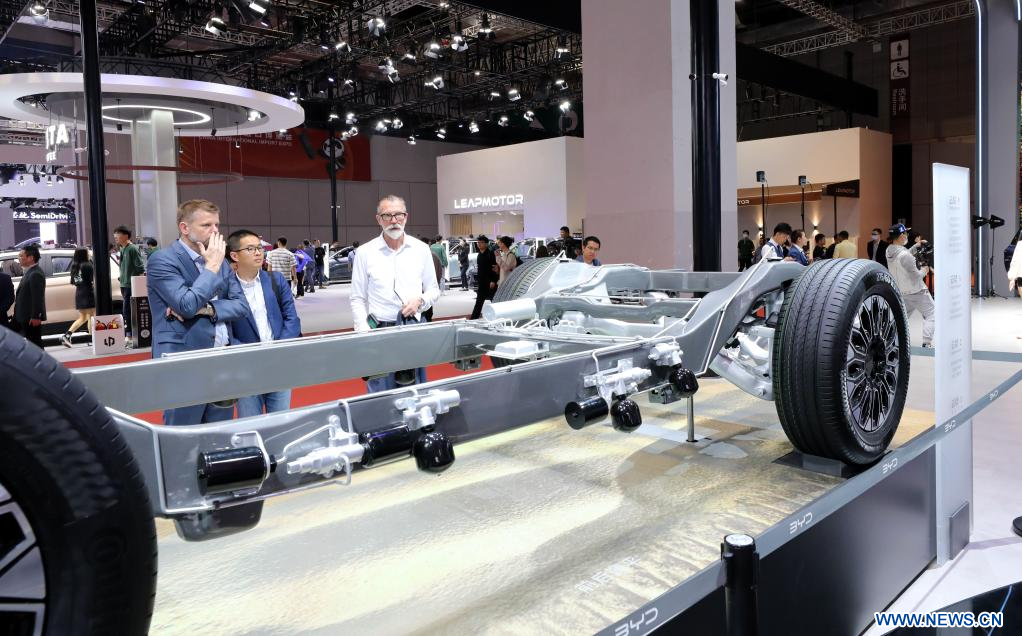 SHANGHAI, 20 avril (Xinhua) -- Un système de contrôle hydraulique intelligent du constructeur automobile chinois BYD lors de la 20e édition du Salon international de l'industrie automobile de Shanghai (Auto Shanghai), à Shanghai, dans l'est de la Chine, le 19 avril 2023. La 20e édition d'Auto Shanghai a débuté mardi au Centre national des expositions et des congrès (Shanghai). A cette occasion, de nombreux constructeurs automobiles présentent leurs véhicules connectés intelligents et à énergies nouvelles dans le cadre de la tendance à la consommation verte et à faibles émissions de carbone. (Photo : Fang Zhe)