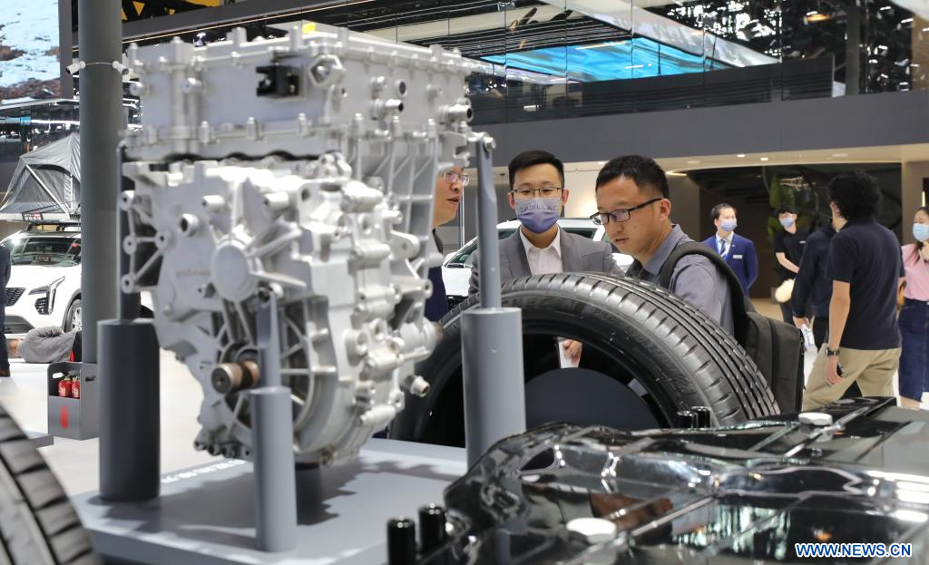 SHANGHAI, 20 avril (Xinhua) -- Des visiteurs discutent en examinant une plate-forme de véhicules à énergies nouvelles de Cadillac lors de la 20e édition du Salon international de l'industrie automobile de Shanghai (Auto Shanghai), à Shanghai, dans l'est de la Chine, le 18 avril 2023. La 20e édition d'Auto Shanghai a débuté mardi au Centre national des expositions et des congrès (Shanghai). A cette occasion, de nombreux constructeurs automobiles présentent leurs véhicules connectés intelligents et à énergies nouvelles dans le cadre de la tendance à la consommation verte et à faibles émissions de carbone. (Photo : Fang Zhe)
