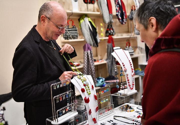 Un exposant présente des bijoux lors de la 87e Foire internationale de l'artisanat à Florence, en Italie, le 25 avril 2023. (Xinhua/Jin Mamengni)