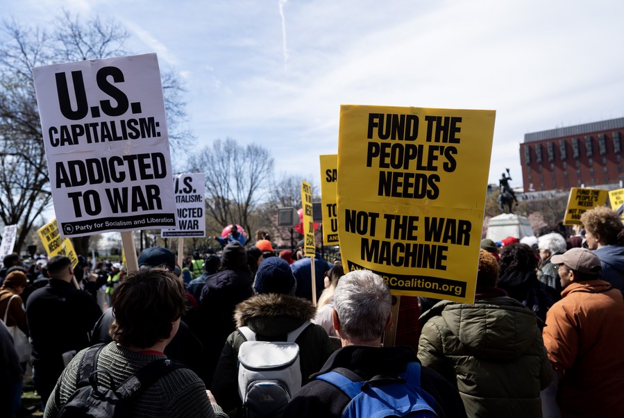 Manifestation contre la guerre à Washington D.C., aux Etats-Unis, le 18 mars 2023. Des centaines de manifestants se rassemblent devant la Maison Blanche à Washington D.C. pour demander l'arrêt des guerres sans fin et de la "machine de guerre", à l'occasion du 20e anniversaire de l'invasion de l'Irak par les Etats-Unis. (Xinhua/Liu Jie)