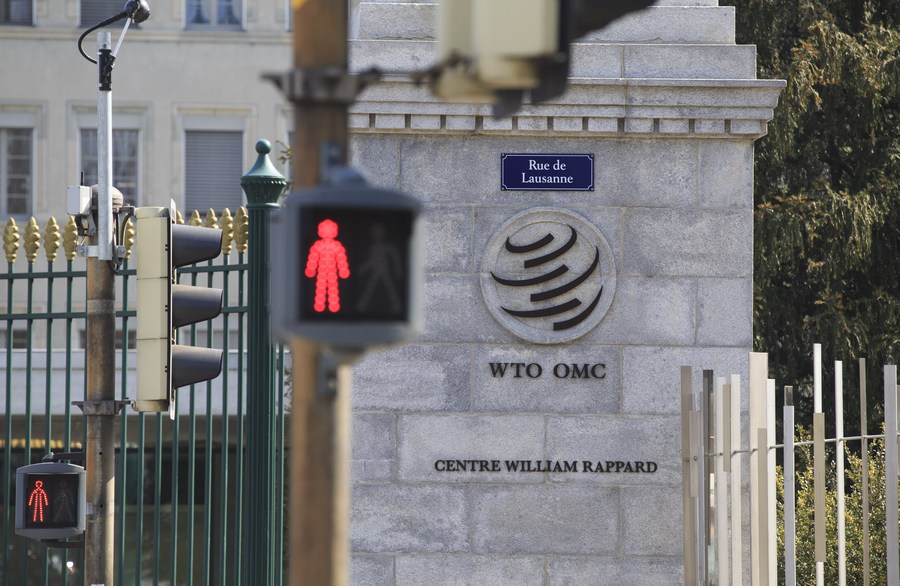 Photo prise le 2 avril 2019 du logo de l'Organisation mondiale du commerce sur la porte principale du siège de l'organisation à Genève, en Suisse. (Xinhua/Xu Jinquan)
