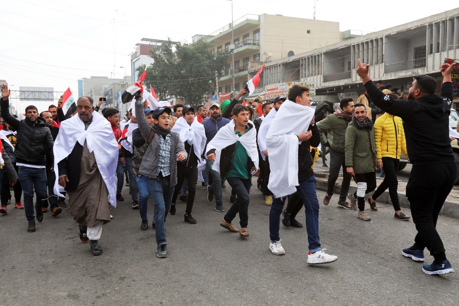 Manifestation contre la présence des troupes américaines à Bagdad, capitale irakienne, le 24 janvier 2020. (Xinhua/Khalil Dawood)