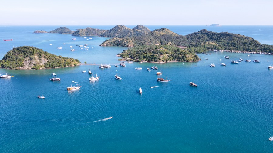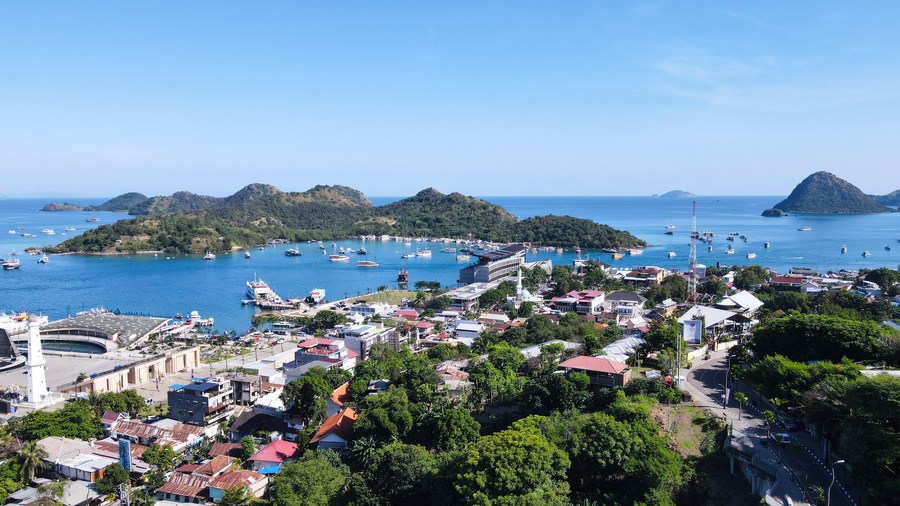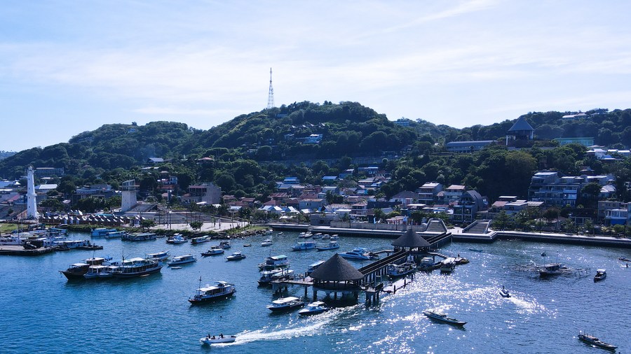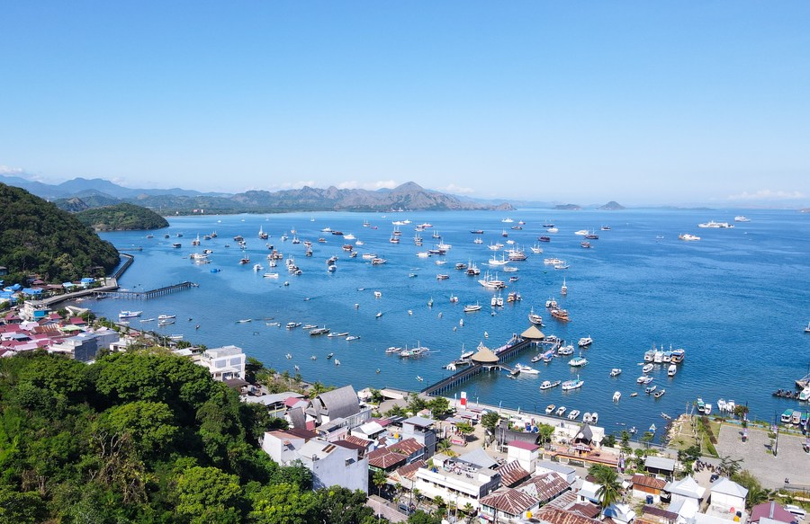 LABUAN BAJO, 13 mai (Xinhua) -- Photo aérienne prise le 12 mai 2023 montrant un paysage de bord de mer à Labuan Bajo, une ville touristique dans la province indonésienne des Petites îles de la Sonde orientales (sud). (Xinhua/Xu Qin)