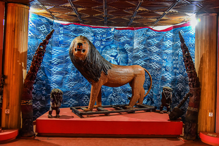 Photo prise le 10 avril 2023 montrant une sculpture de lion exposée au musée des civilisations du Cameroun à Dschang, au Cameroun. Avec une superficie d'environ 1.000 mètres carrés, le musée a été officiellement ouvert au public en 2010. (Xinhua/Kepseu)