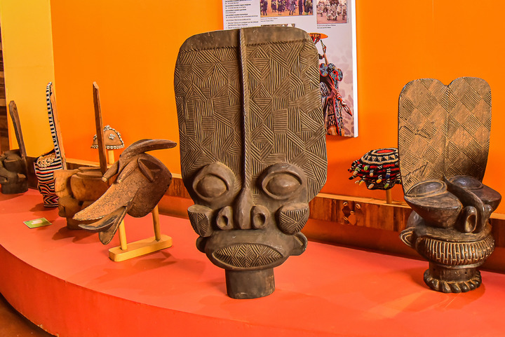 Photo prise le 10 avril 2023 montrant des masques exposés au musée des civilisations du Cameroun à Dschang, au Cameroun. Avec une superficie d'environ 1.000 mètres carrés, le musée a été officiellement ouvert au public en 2010. (Xinhua/Kepseu)