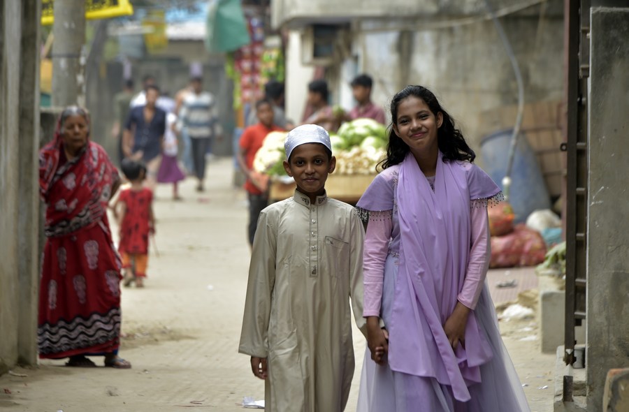 Photo prise le 28 novembre 2022 montrant Alifa Chin ("Chine" en bengali), née sur le navire-hôpital chinois "Arche de la paix" en 2010, et son frère marchant dans une ruelle de Dacca, au Bangladesh. (Xinhua)