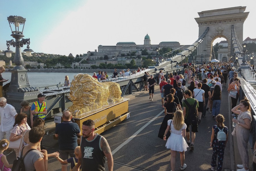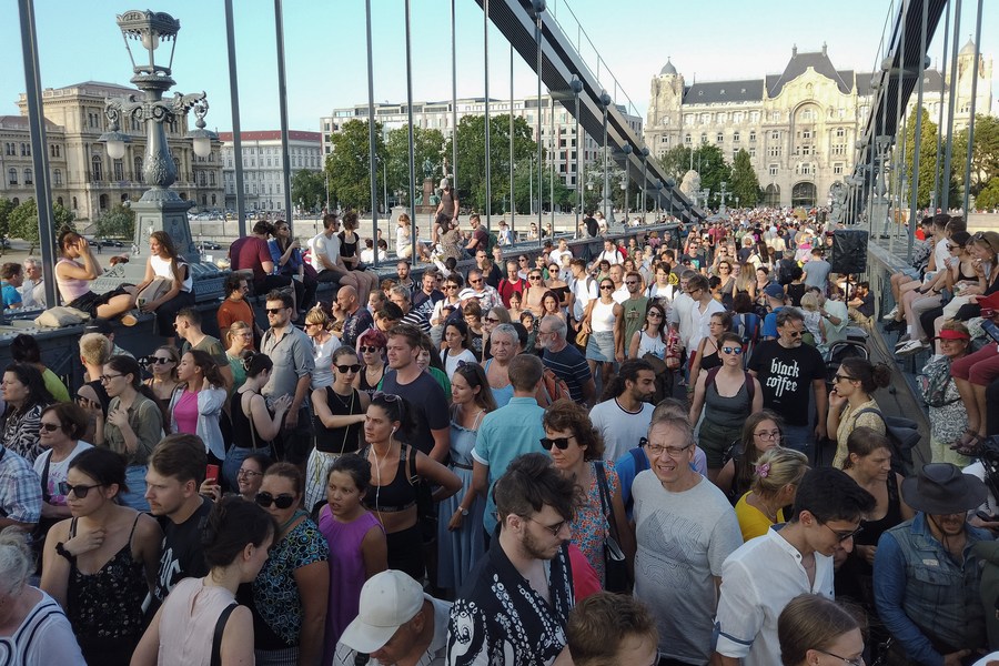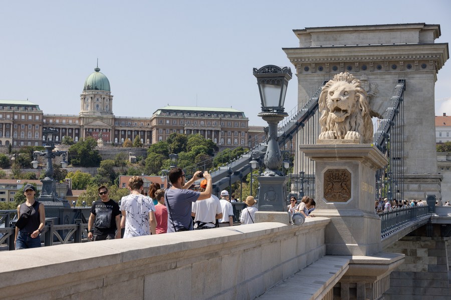 Des gens prennent des photos du pont des Chaînes (Szechenyi) à Budapest, en Hongrie, le 4 août 2023. (Xinhua/Attila Volgyi)