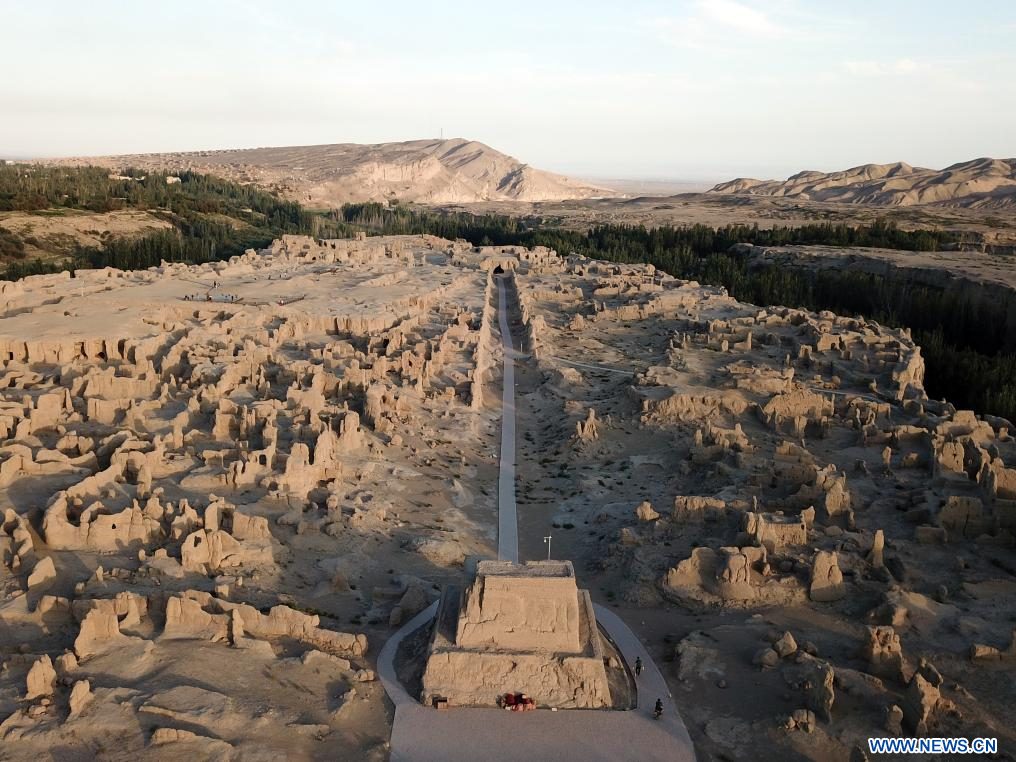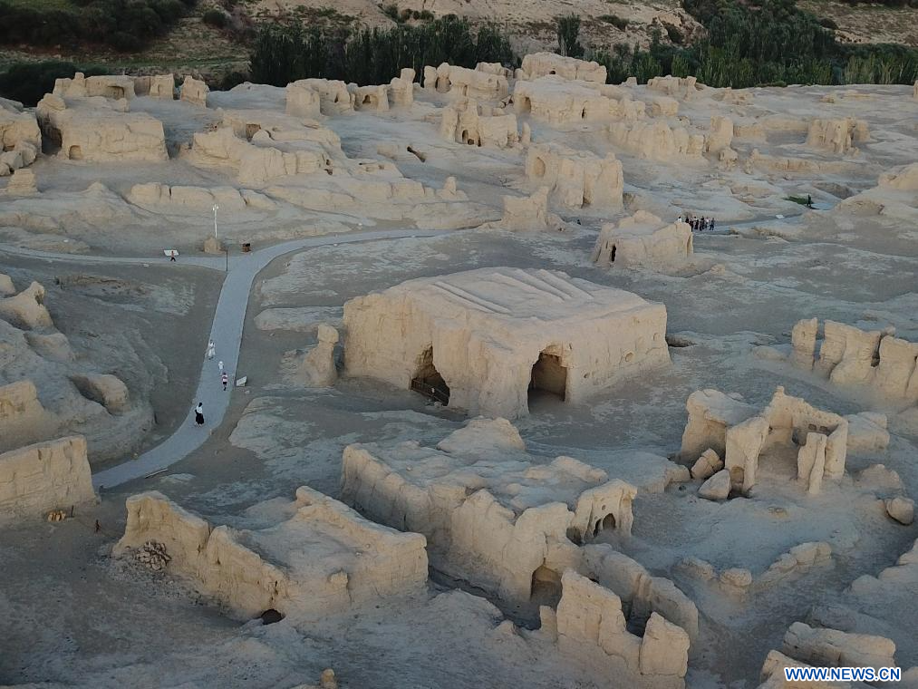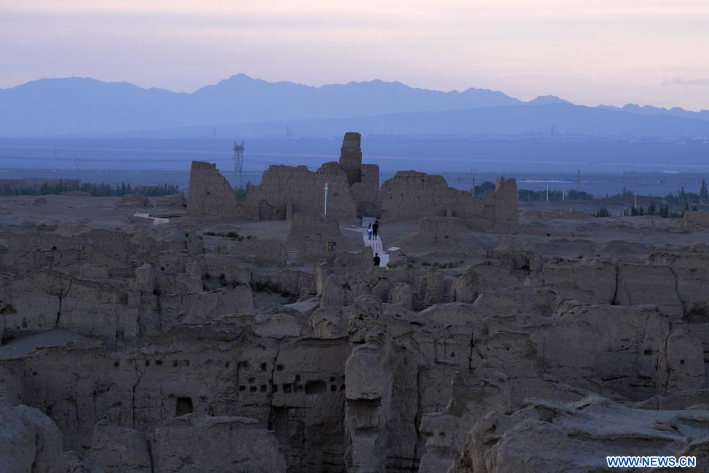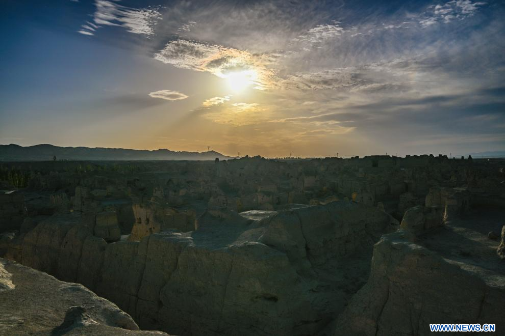 TOURFAN, 13 août (Xinhua) -- La vieille cité de Jiaohe au coucher du soleil à Tourfan, dans la région autonome ouïgoure du Xinjiang, dans le nord-ouest de la Chine, le 11 août 2023. La vieille cité de Jiaohe, située dans l'oasis au nord du bassin de Tourfan, était autrefois une ville importante sur l'ancienne Route de la soie et a été classée unité clé de protection des reliques culturelles de niveau national en 1961. (Photo : Ma Ning)