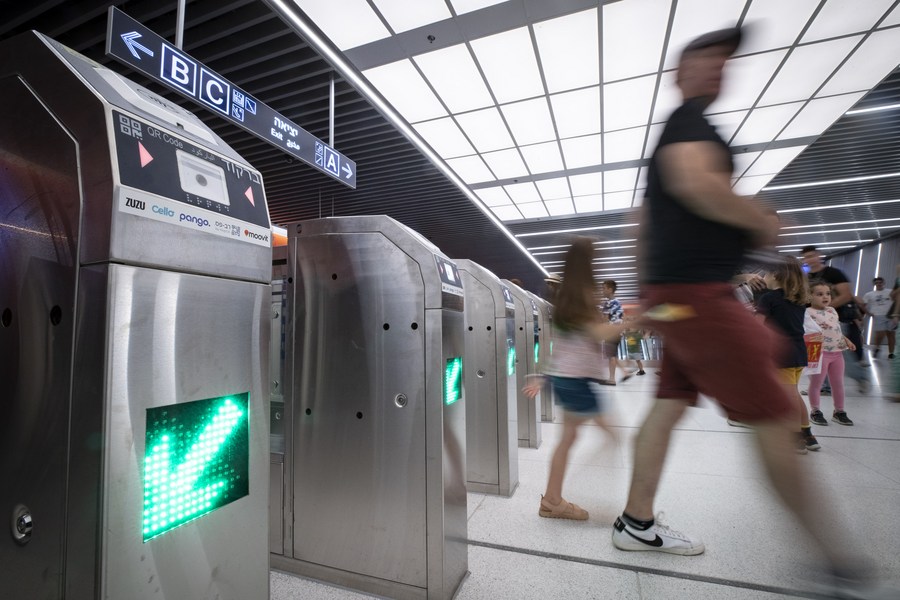 TEL AVIV, 19 août (Xinhua) -- Des passagers entrent dans la station de tramway Allenby à Tel Aviv, en Israël, le 18 août 2023. Environ 100.000 personnes de tout Israël ont profité d'un trajet gratuit en tramway vendredi à Tel Aviv, pour marquer le premier jour opérationnel de la ligne rouge construite et exploitée conjointement par des sociétés chinoises et israéliennes. (Xinhua/Chen Junqing)
