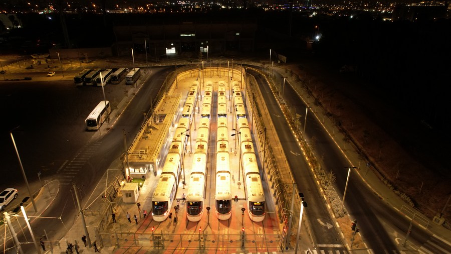 Photo aérienne montrant des trains de la ligne rouge du tramway stationnés à Tel Aviv, en Israël, le 18 août 2023. Environ 100.000 personnes de tout Israël ont profité d'un trajet gratuit en tramway vendredi à Tel Aviv, pour marquer le premier jour opérationnel de la ligne rouge construite et exploitée conjointement par des sociétés chinoises et israéliennes. (Xinhua/Chen Junqing)