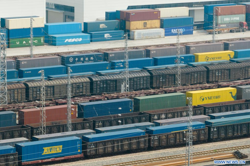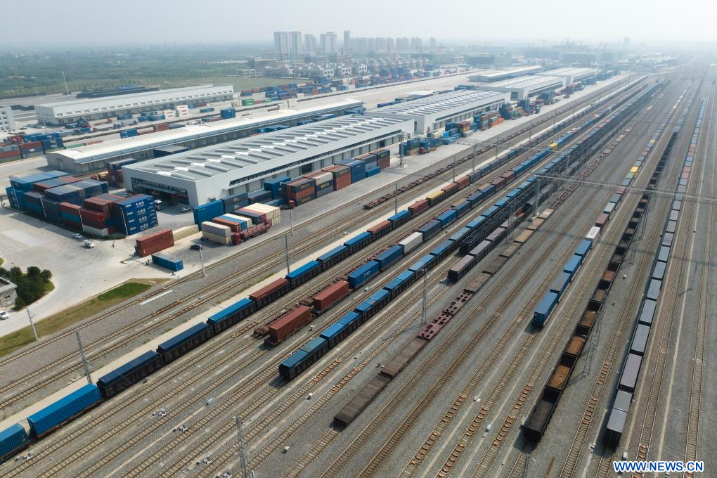 XI'AN, 24 septembre (Xinhua) -- Photo aérienne prise le 7 septembre 2023 montrant la plateforme logistique internationale de Xi'an à Xi'an, de la province du Shaanxi (nord-ouest). Le service de trains de fret Chine-Europe "Chang'an" a été lancé en 2013, année où la Chine a proposé l'Initiative "la Ceinture et la Route". Au cours des dix dernières années, la plateforme logistique internationale de Xi'an, gare de départ des trains de fret Chine-Europe "Chang'an", est passée du stade de petite gare de marchandises à celui d'un centre logistique international. (Photo : Shao Rui)