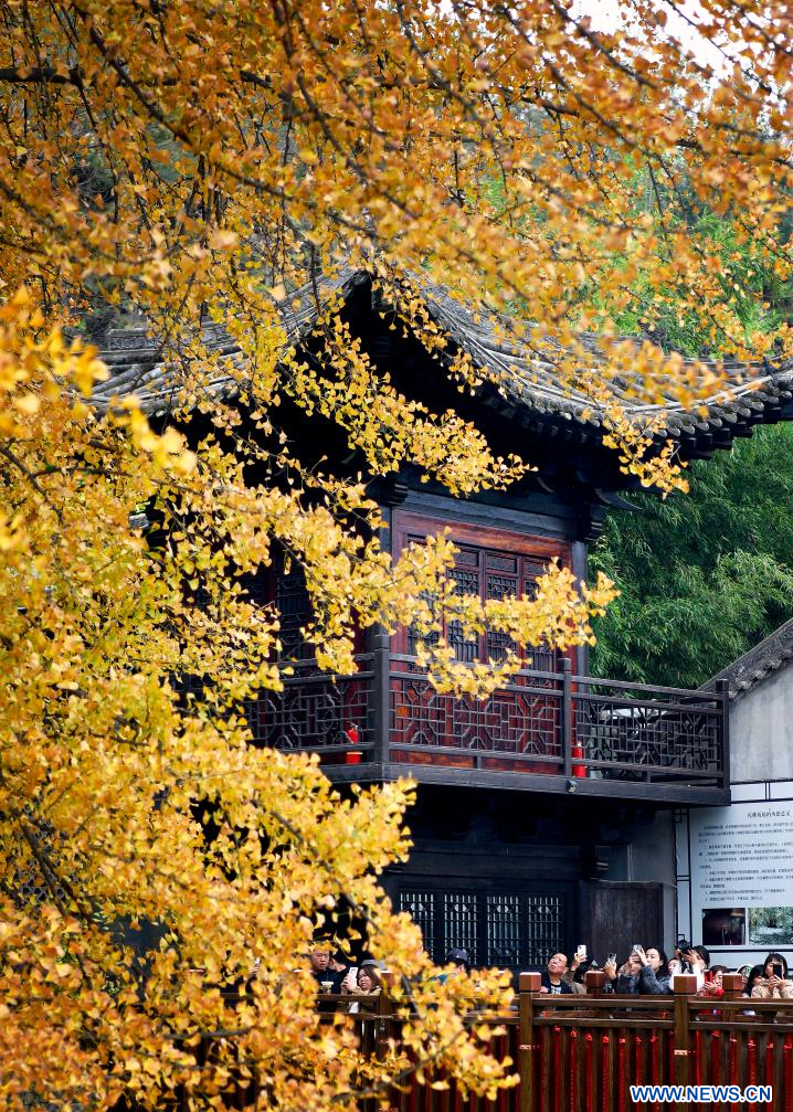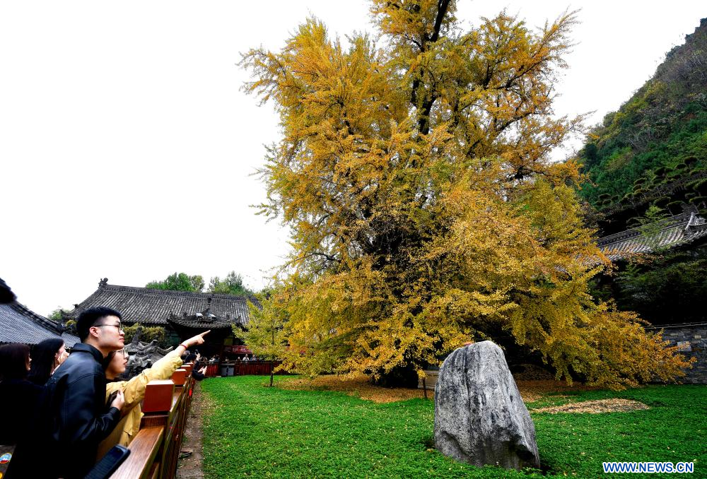 XI'AN, 1er novembre (Xinhua) -- Des visiteurs devant un ginkgo dans un temple à Xi'an, dans la province chinoise du Shaanxi (nord-ouest), le 31 octobre 2023. (Photo : Liu Xiao)