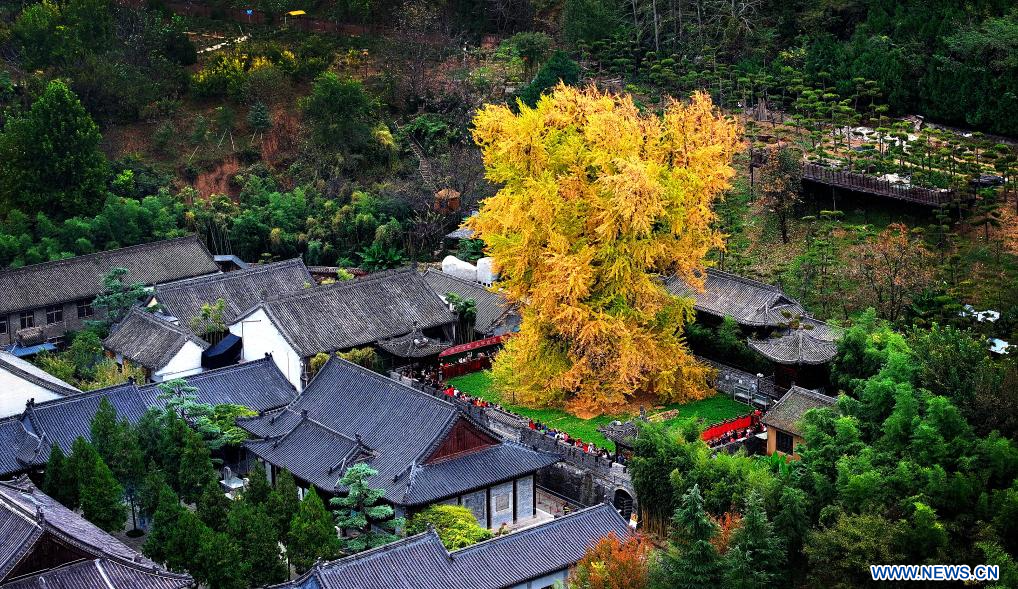 XI'AN, 1er novembre (Xinhua) -- Photo aérienne d'un ginkgo dans un temple à Xi'an, dans la province chinoise du Shaanxi (nord-ouest), le 31 octobre 2023. (Photo : Liu Xiao)