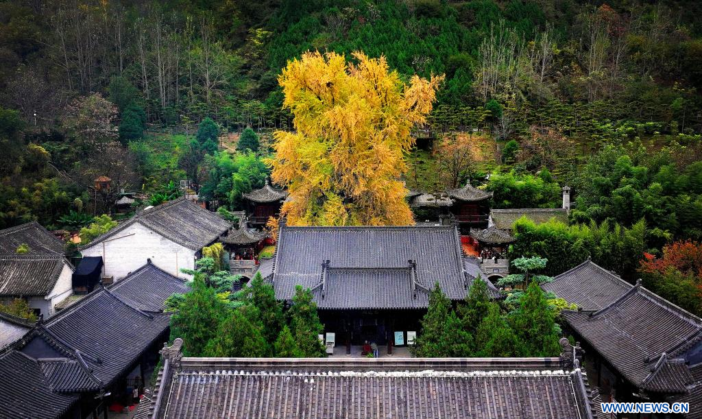 XI'AN, 1er novembre (Xinhua) -- Photo d'un ginkgo dans un temple à Xi'an, dans la province chinoise du Shaanxi (nord-ouest), le 31 octobre 2023. (Photo : Liu Xiao)
