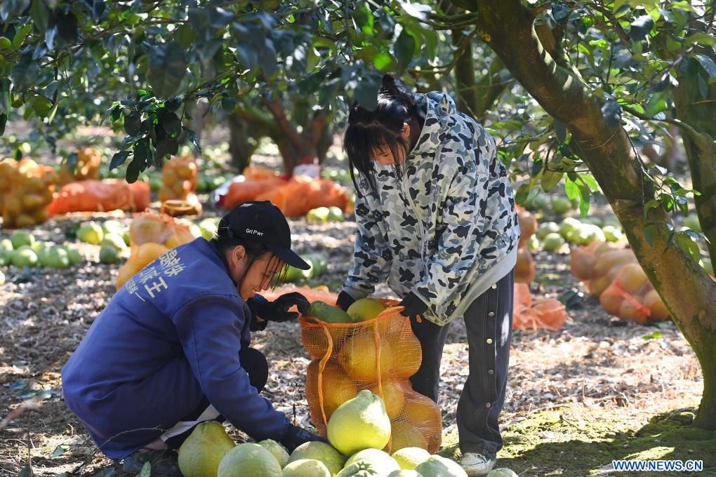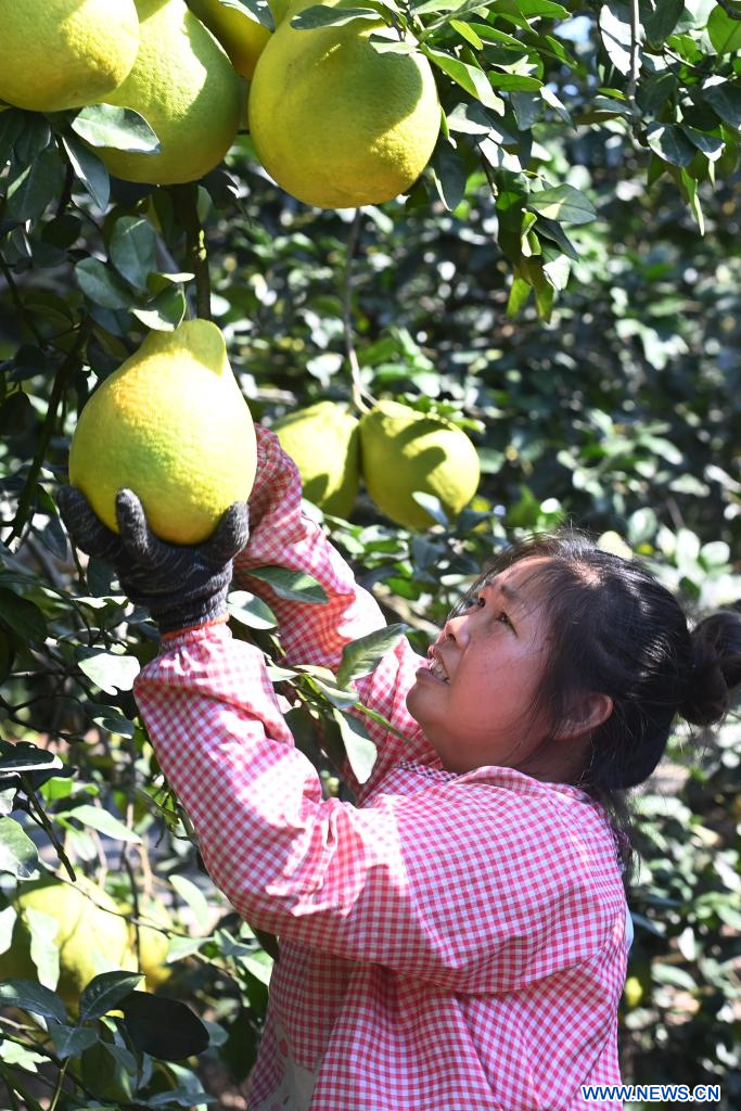 LUOCHENG, 22 novembre (Xinhua) -- Une villageoise récolte des pamplemousses dans une zone de démonstration de l'industrie écologique dans le district autonome Mulao de Luocheng, dans la région autonome Zhuang du Guangxi (sud), le 21 novembre 2023. Les pamplemousses dans la zone de démonstration de l'industrie écologique ont récemment inauguré la saison de récolte à Luocheng. (Photo : Meng Zengshi)