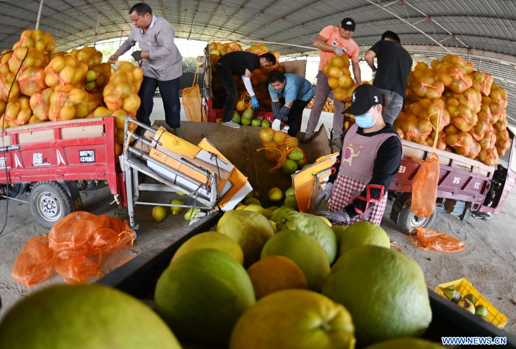 LUOCHENG, 22 novembre (Xinhua) -- Des villageois emballent des pamplemousses dans une zone de démonstration de l'industrie écologique dans le district autonome Mulao de Luocheng, dans la région autonome Zhuang du Guangxi (sud), le 21 novembre 2023. Les pamplemousses dans la zone de démonstration de l'industrie écologique ont récemment inauguré la saison de récolte à Luocheng. (Photo : Meng Zengshi)