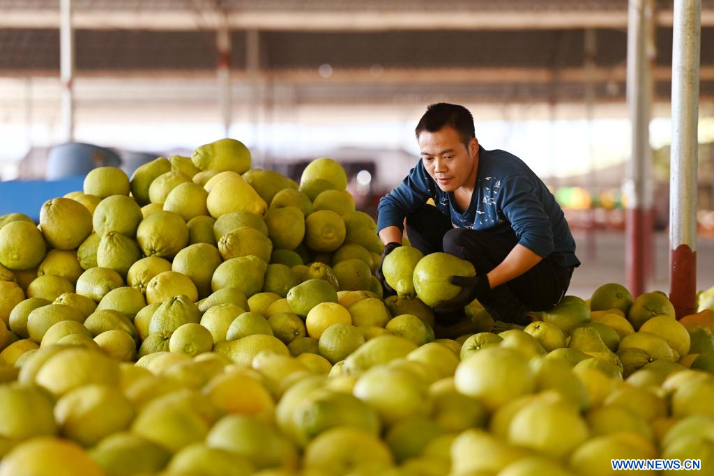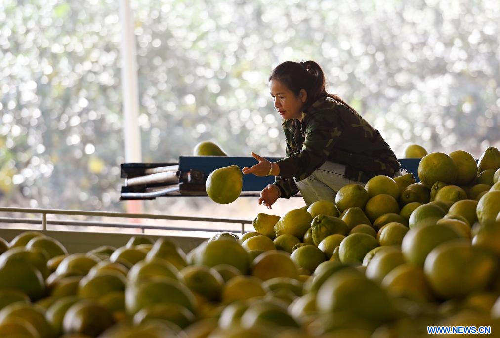 LUOCHENG, 22 novembre (Xinhua) -- Un villageois trie des pamplemousses dans une zone de démonstration de l'industrie écologique dans le district autonome Mulao de Luocheng, dans la région autonome Zhuang du Guangxi (sud), le 21 novembre 2023. Les pamplemousses dans la zone de démonstration de l'industrie écologique ont récemment inauguré la saison de récolte à Luocheng. (Photo : Meng Zengshi)