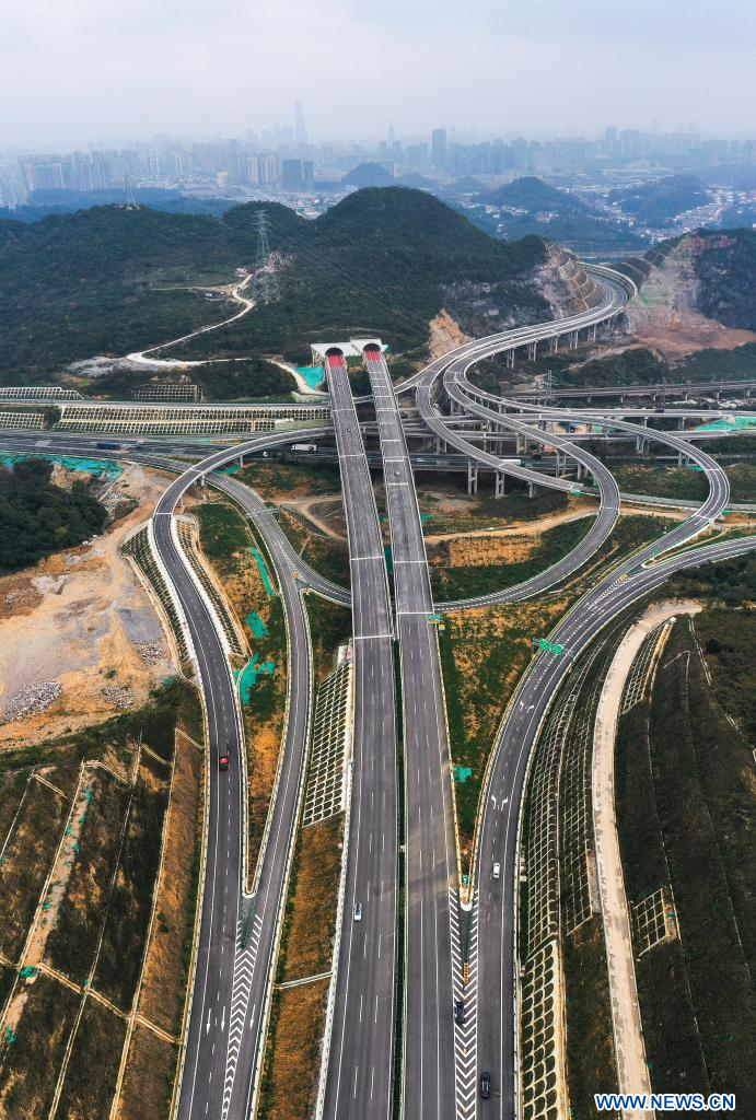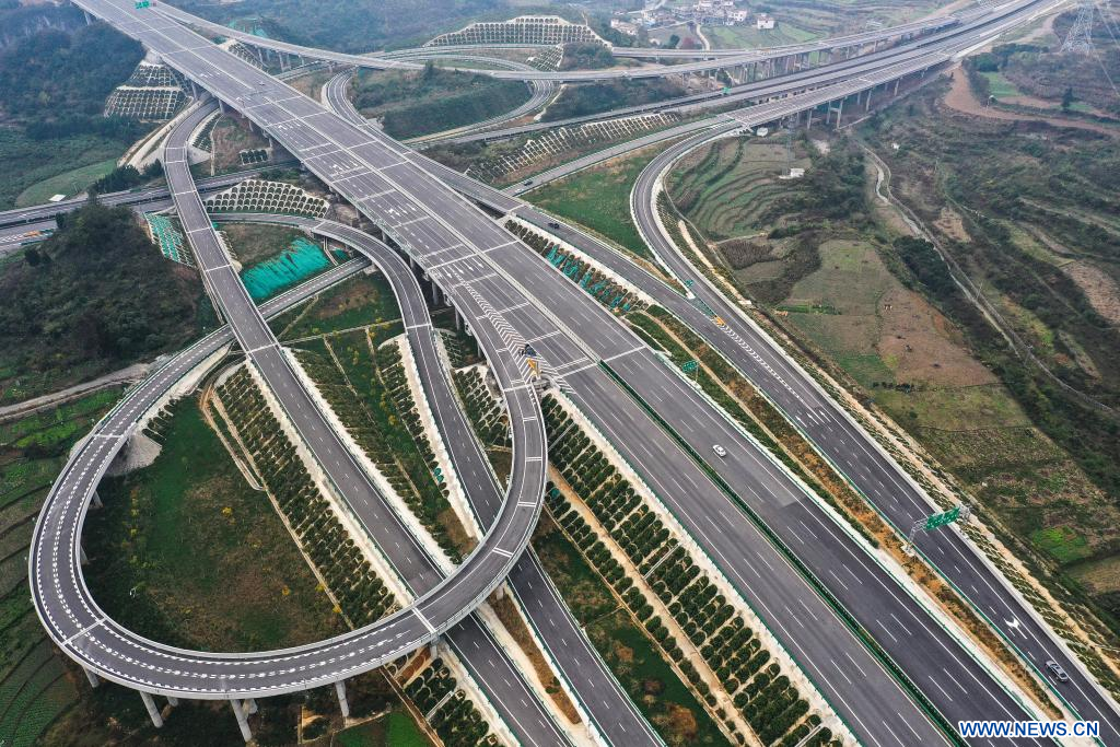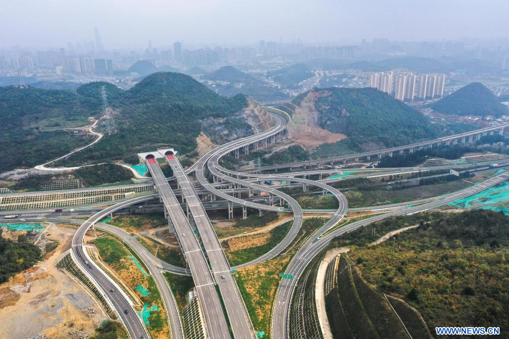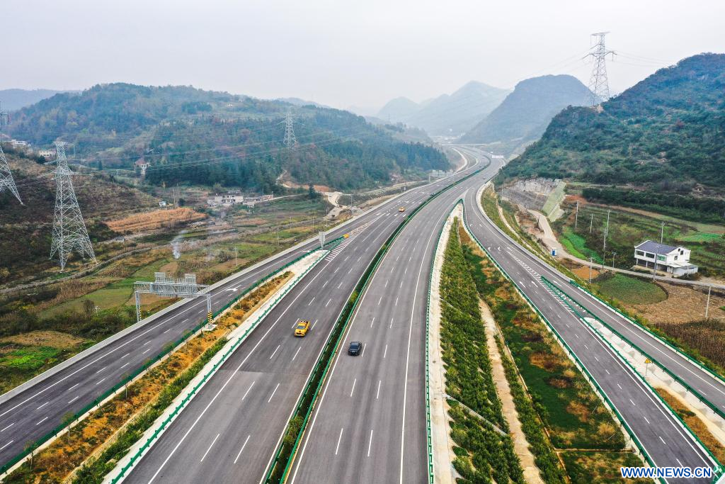 GUIYANG, 25 novembre (Xinhua) -- Photo aérienne prise le 24 novembre 2023 montre des véhicules circulant sur l'autoroute reliant Guiyang, capitale de la province du Guizhou (sud-ouest), à Gulin, dans la province du Sichuan (sud-ouest), en passant par Jinsha du Guizhou. L'autoroute Guiyang-Jinsha-Gulin, qui est officiellement entrée en service vendredi, réduit de moitié le temps de trajet entre Guiyang et le district de Jinsha, passant de deux heures à environ une heure. (Photo : Yang Wenbin)
