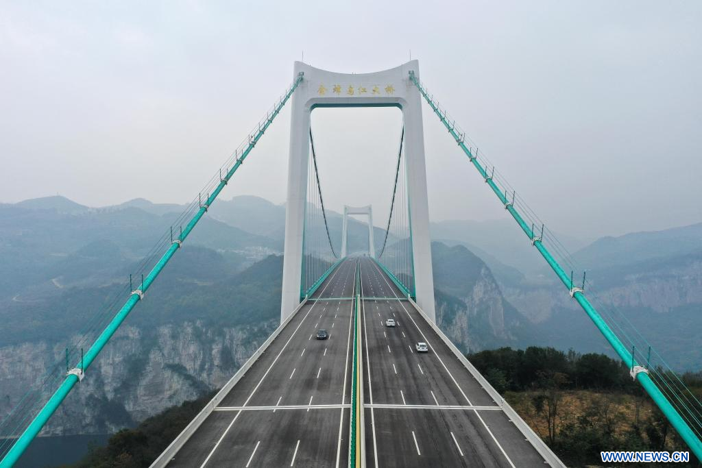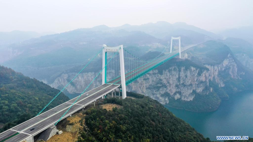 GUIYANG, 25 novembre (Xinhua) -- Photo aérienne prise le 24 novembre 2023 montre des véhicules circulant sur le pont de Jinfeng Wujiang le long de l'autoroute reliant Guiyang, capitale de la province du Guizhou (sud-ouest), à Gulin, dans la province du Sichuan (sud-ouest), en passant par Jinsha du Guizhou. L'autoroute Guiyang-Jinsha-Gulin, qui est officiellement entrée en service vendredi, réduit de moitié le temps de trajet entre Guiyang et le district de Jinsha, passant de deux heures à environ une heure. (Photo : Yang Wenbin)