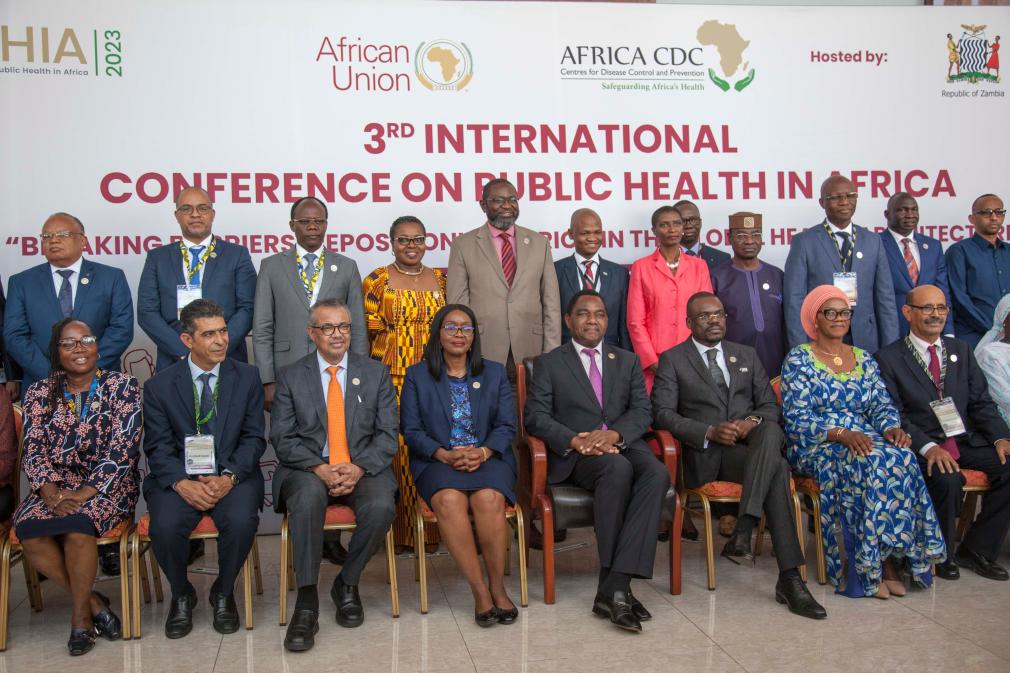 LUSAKA, 27 novembre (Xinhua) -- Des dirigeants et des représentants posent pour une photo lors de la troisième Conférence internationale sur la santé publique en Afrique à Lusaka, en Zambie, le 27 novembre 2023. Cette conférence s'est ouverte lundi avec un appel au renforcement des partenariats et des investissements pour améliorer la prestation des soins. (Xinhua/Martin Mbangweta)