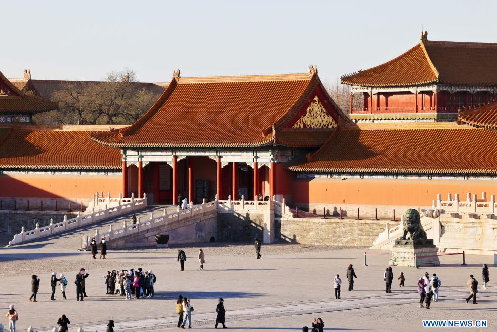 BEIJING, 30 novembre (Xinhua) -- Des touristes visitent le Musée du Palais, également connu sous le nom de Cité interdite, à Beijing, capitale chinoise, le 29 novembre 2023. (Photo : Zhang Yuwei)