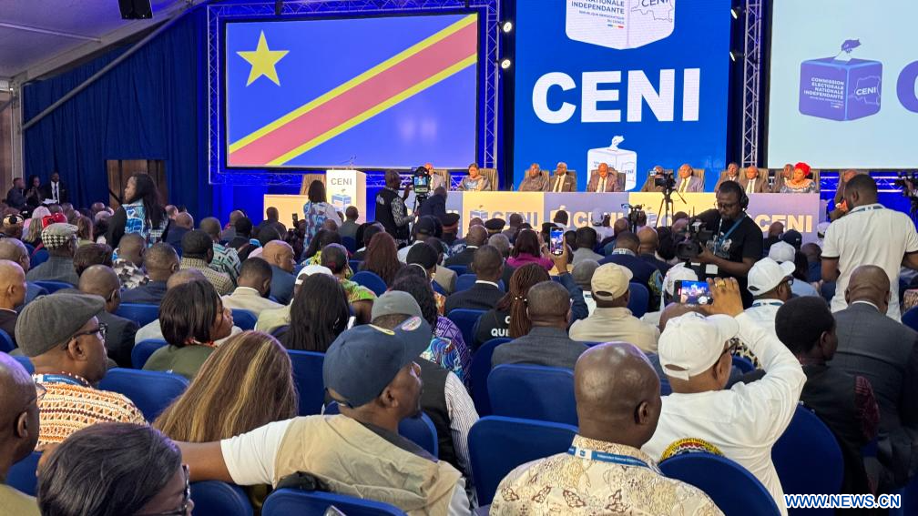 Photo prise le 31 décembre 2023 à Kinshasa, la capitale de la République démocratique du Congo (RDC), montrant une réunion organisée par la Commission électorale nationale indépendante (CENI) pour annoncer les résultats préliminaires de l'élection présidentielle du pays. Le président sortant Félix Tshisekedi a été réélu pour un second mandat de cinq ans, après avoir recueilli 73,34% des voix lors de la présidentielle du 20 décembre, selon les résultats provisoires annoncés dimanche par la CENI. (Xinhua/Alain Uyakani)