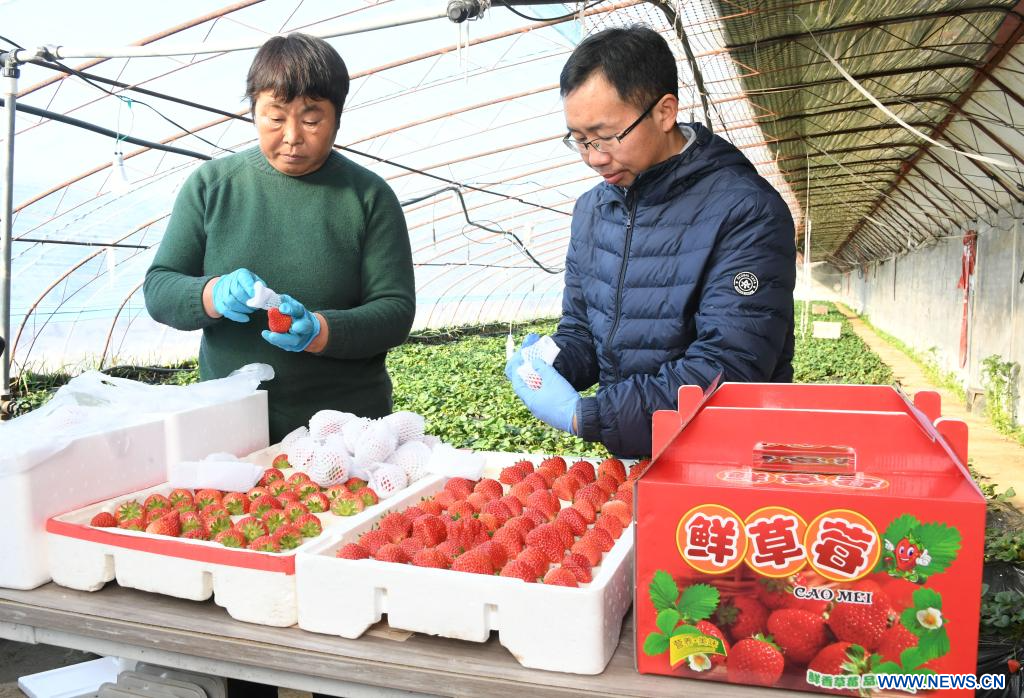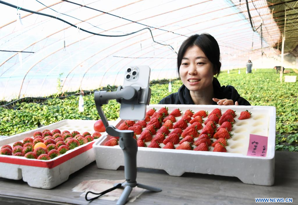 BEIJING, 26 janvier (Xinhua) -- Une employée fait la promotion de fraises par livestreaming dans une serre de l'arrondissement de Pinggu, à Beijing, capitale chinoise, le 25 janvier 2024. Les agriculteurs de la région s'affairent à récolter les fraises cultivées en serre afin de répondre aux besoins des clients pour les vacances à venir de la fête du Printemps. (Photo : Ren Chao)