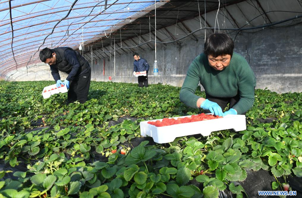 BEIJING, 26 janvier (Xinhua) -- Des agriculteurs récoltent des fraises dans une serre de l'arrondissement de Pinggu, à Beijing, capitale chinoise, le 25 janvier 2024. Les agriculteurs de la région s'affairent à récolter les fraises cultivées en serre afin de répondre aux besoins des clients pour les vacances à venir de la fête du Printemps. (Photo : Ren Chao)