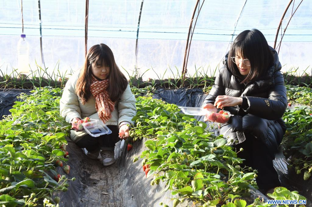 BEIJING, 26 janvier (Xinhua) -- Des visiteuses récoltent des fraises dans une serre de l'arrondissement de Pinggu, à Beijing, capitale chinoise, le 25 janvier 2024. Les agriculteurs de la région s'affairent à récolter les fraises cultivées en serre afin de répondre aux besoins des clients pour les vacances à venir de la fête du Printemps. (Photo : Ren Chao)