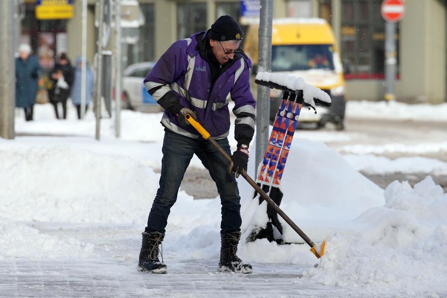 RIGA, 9 février (Xinhua) -- Un homme déneige un trottoir à Riga, en Lettonie, le 8 février 2024. La capitale lettone de Riga a été frappée par 16 centimètres de neige jeudi. (Xinhua/Edijs Palens)