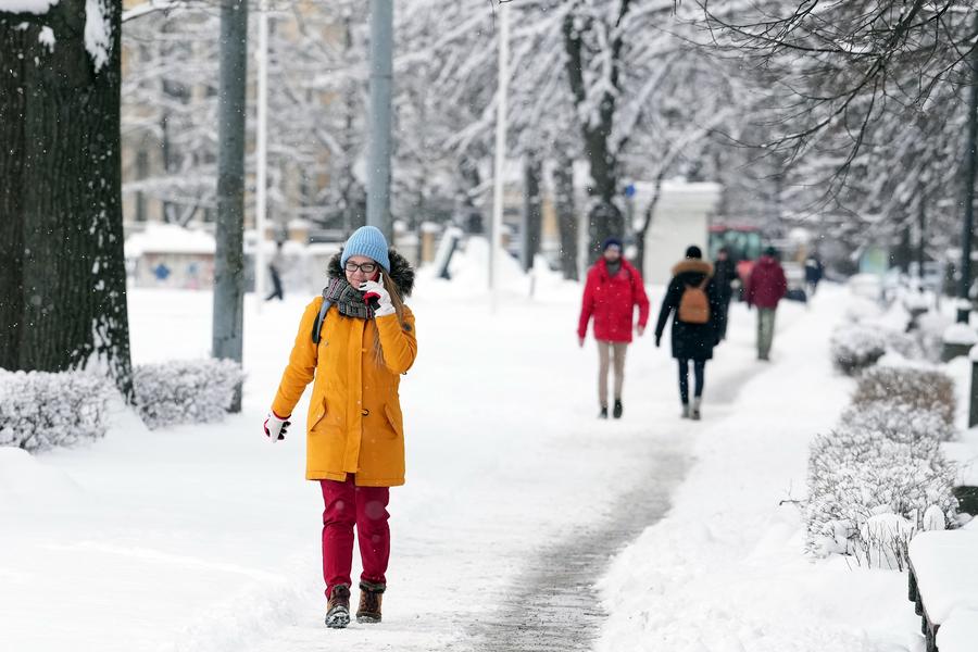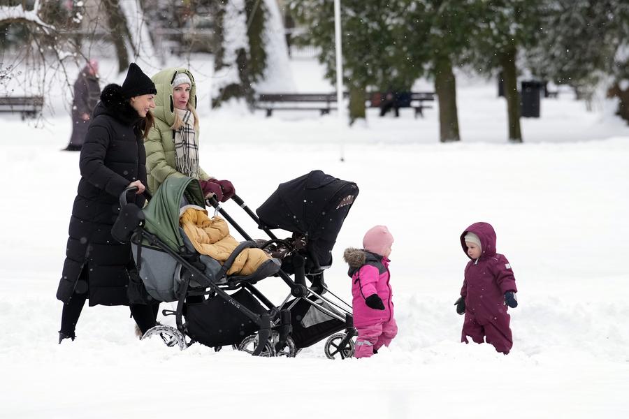 Des personnes marchent sur une route enneigée à Riga, en Lettonie, le 8 février 2024.