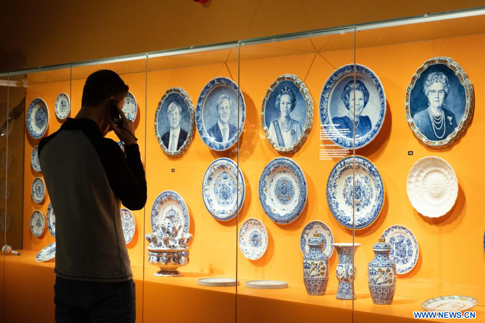 DELFT, 24 février (Xinhua) -- Un homme regarde des pièces en porcelaine exposées au Musée royal de Delft, à Delft, aux Pays-Bas, le 23 février 2024. (Xinhua/Meng Dingbo)