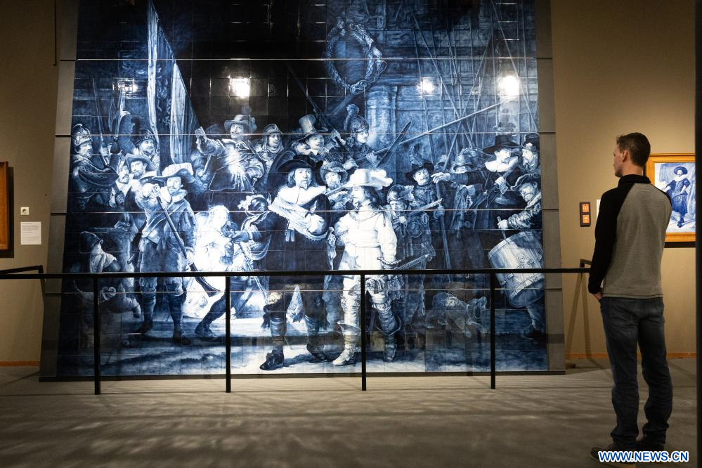 DELFT, 24 février (Xinhua) -- Un homme regarde une réplique en céramique du célèbre tableau de Rembrandt, La ronde de nuit, au Musée royal de Delft, à Delft, aux Pays-Bas, le 23 février 2024. (Xinhua/Meng Dingbo)