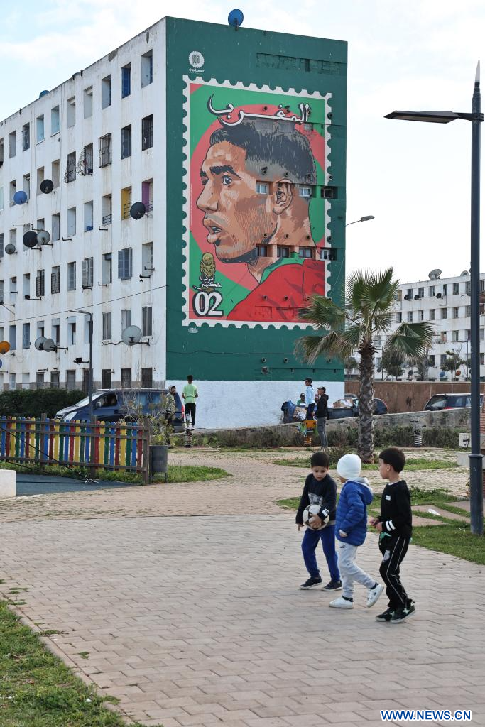 CASABLANCA, 4 mars (Xinhua) -- Photo prise le 3 mars 2024 montrant des enfants jouant au football près d'une peinture murale représentant Achraf Hakimi, star de l'équipe nationale marocaine de football, à Casablanca, au Maroc. Casablanca est la plus grande ville du Maroc et le centre économique et de transport du pays. (Xinhua/Huo Jing)