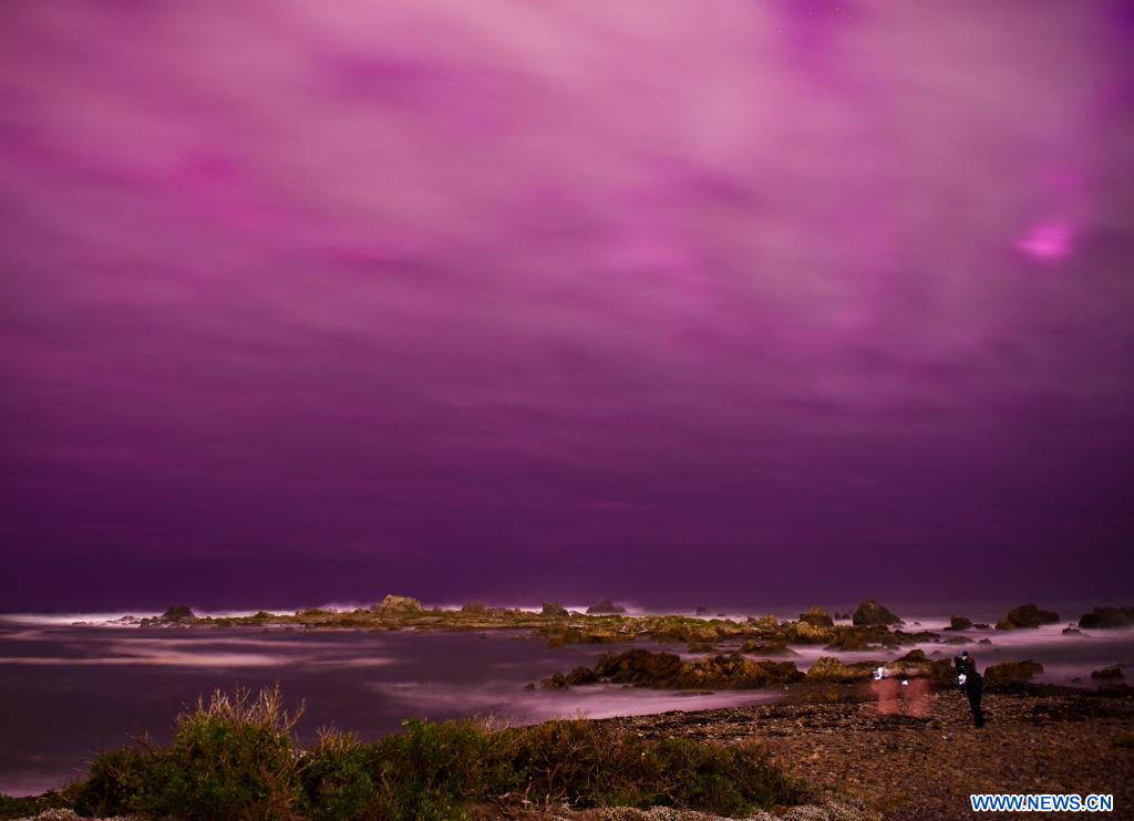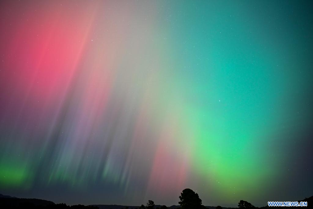 WELLINGTON, 11 mai (Xinhua) -- Photo prise le 11 mai 2024 de l'aurore australe, également connue sous le nom de "lumières du sud", à Wellington, en Nouvelle-Zélande. (Xinhua/Guo Lei)